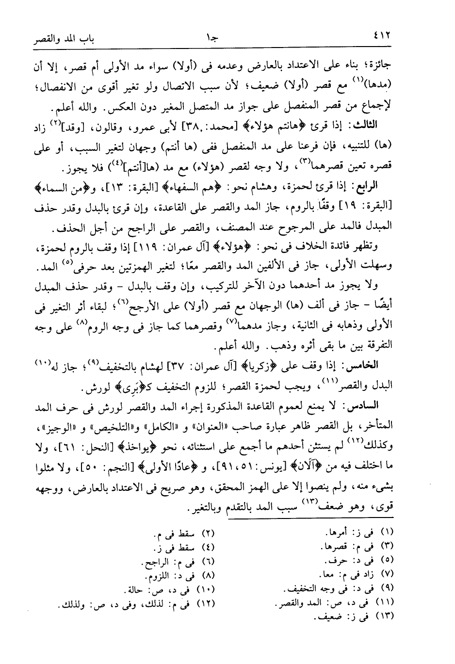 ولا يجوز مد أحدهما دون الآخر للتركيب، وإن وقف بالبدل- وقدر حذف المبدل أيضا- جاز فى ألف (ها) الوجهان مع قصر (أولا) على الأرجح (¬6)؛ لبقاء أثر التغير فى الأولى وذهابه فى الثانية، وجاز مدهما (¬7) وقصرهما كما جاز فى وجه الروم (¬8) على وجه التفرقة بين ما بقى أثره وذهب. والله أعلم.