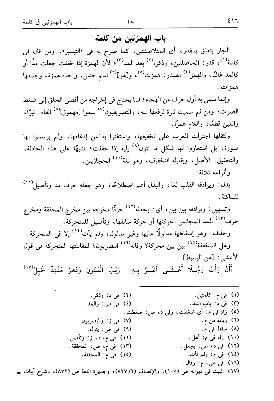 الجار يتعلق بمقدر، أى المتلاصقتين، كما صرح به فى «التيسير»، ومن قال فى كلمة (¬1)، قدر: الحاصلتين، وذكره (¬2) بعد المد (¬3)؛ لأن الهمزة إذا خففت جعلت مدّا أو كالمد غالبا، والهمز (¬4) مصدر: همزت (¬5)، و [هو] (¬6) اسم جنس، واحده همزة، وجمعها همزات.