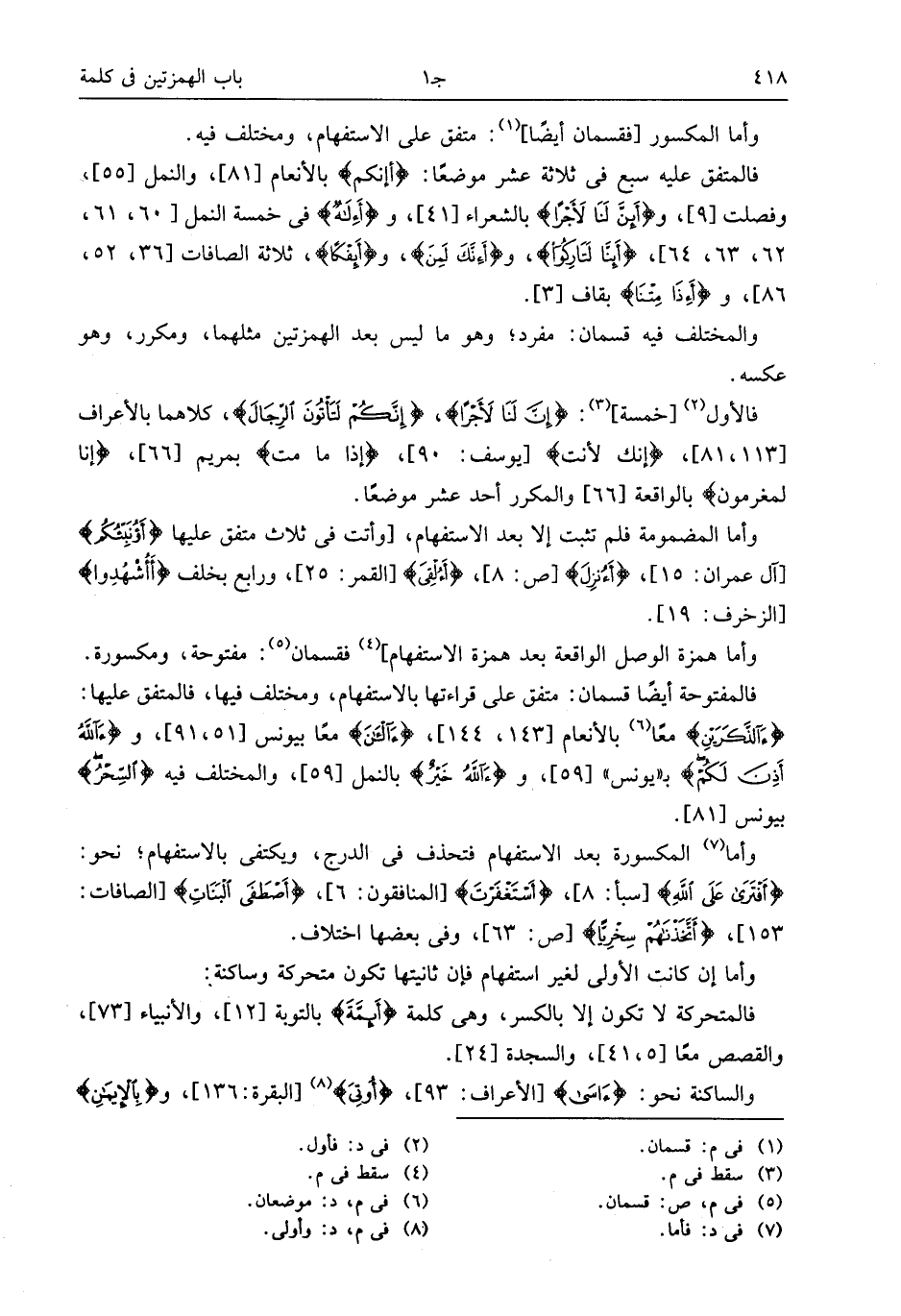 فالمتفق عليه سبع فى ثلاثة عشر موضعا: أأَنَّكُمْ* بالأنعام [81]، والنمل [55]، وفصلت [9]، وأَ إِنَّ لَنا لَأَجْراً بالشعراء [41]، وأَ إِلهٌ* فى خمسة النمل [60، 61، 62، 63، 64]، أَإِنَّا لَتارِكُوا، وأَ إِنَّكَ لَمِنَ، وأَ إِفْكاً، ثلاثة الصافات [36، 52، 86]، وأَ إِذا مِتْنا بقاف [3].
