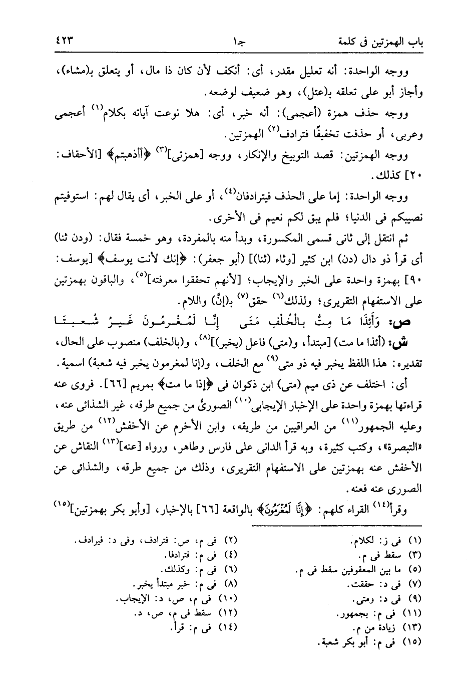 ووجه الواحدة: أنه تعليل مقدر، أى: أنكف لأن كان ذا مال، أو يتعلق ب (مشاء)، وأجاز أبو على تعلقه ب (عتل)، وهو ضعيف لوضعه.