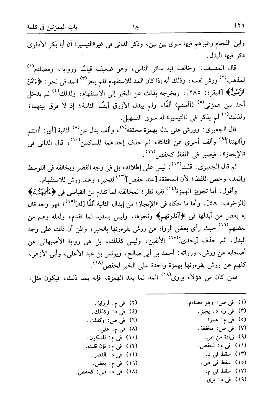 قال الجعبرى: وورش على بدله بهمزة محققة (¬7)، وألف بدل عن (¬8) الثانية [أى: أامنتم وأ آلهتنا] (¬9) وألف أخرى عن الثالثة، ثم حذف إحداهما للساكنين (¬10)، قال الدانى فى «الإيجاز»: فيصير فى اللفظ كحفص (¬11).