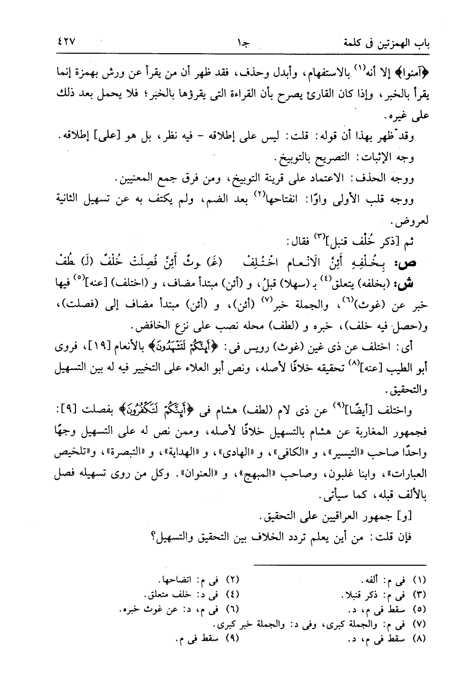 آمَنُوا* إلا أنه (¬1) بالاستفهام، وأبدل وحذف، فقد ظهر أن من يقرأ عن ورش بهمزة إنما يقرأ بالخبر، وإذا كان القارئ يصرح بأن القراءة التى يقرؤها بالخبر؛ فلا يحمل بعد ذلك على غيره.