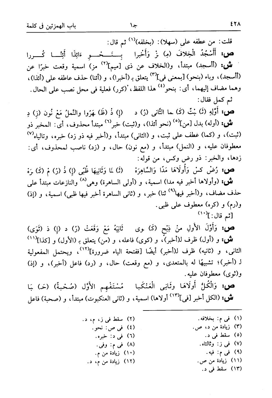 ش: (أأسجد) مبتدأ، و (الخلاف عن ذى [ميم] (¬2) مز) اسمية وقعت خبرا عن (أأسجد)، وباء (بنحو) [بمعنى فى] (¬3) يتعلق ب (أخبرا)، و (أئنا) حذف عاطفه على (أئذا)، وهما مضاف إليهما، أى: بنحو (¬4) هذا اللفظ، (كرر) فعلية فى محل نصب على الحال.