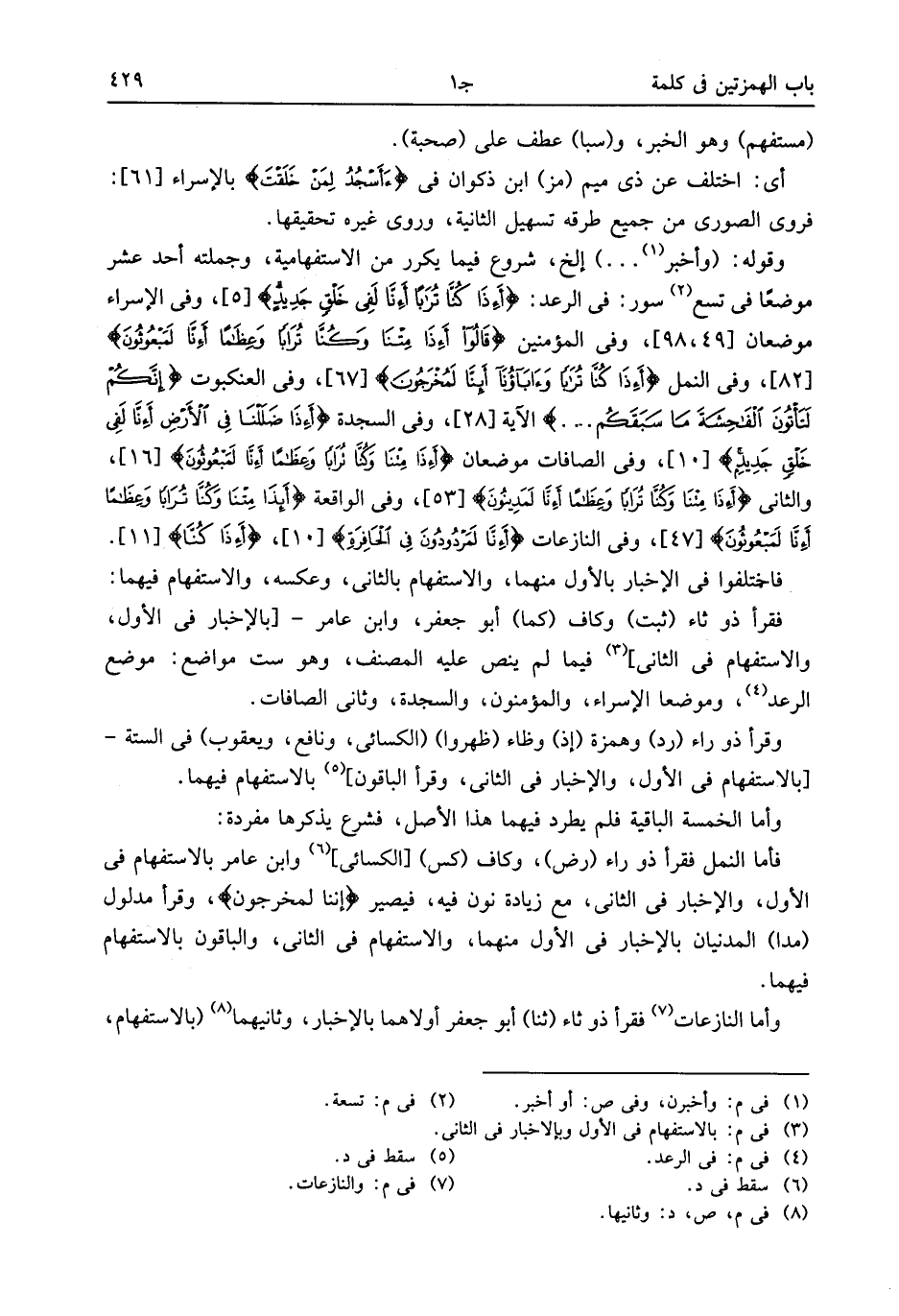 وقرأ ذو راء (رد) وهمزة (إذ) وظاء (ظهروا) (الكسائى، ونافع، ويعقوب) فى الستة-[بالاستفهام فى الأول، والإخبار فى الثانى، وقرأ الباقون] (¬5) بالاستفهام فيهما.