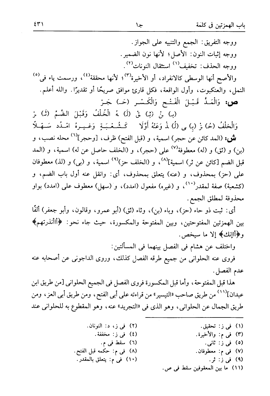 هذا قبل المفتوحة، وأما قبل المكسورة فروى الفصل فى الجميع الحلوانى [من طريق ابن عبدان] (¬11) من طريق صاحب «التيسير» من قراءته على أبى الفتح، ومن طريق أبى العز، ومن طريق الجمال عن الحلوانى، وهو الذى فى «التجريد» عنه، وهو المقطوع به للحلوانى عند