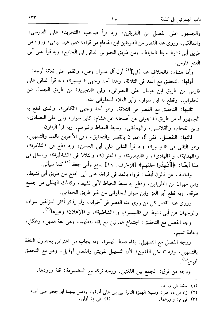 ثالثها: التفصيل، ففي آل عمران بالقصر والتحقيق، وفى الآخرين بالمد والتسهيل، وهو الثانى فى «التيسير»، وبه قرأ الدانى على أبى الحسن، وبه قطع فى «التذكرة»، و «الهداية»، و «الهادى»، و «التبصرة»، و «العنوان»، والثلاثة فى «الشاطبية»، ويدخل فى هذا أيضا: آأشهدوا خلقهم [الزخرف: 19] لنافع وأبى جعفر (¬2) كما سيأتى.