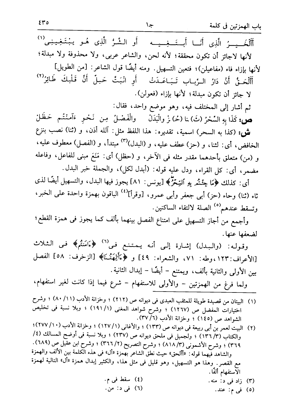 وقوله: (والبدل) إشارة إلى أنه يمتنع فى (¬6) آمَنْتُمْ* فى الثلاث [الأعراف: 123، وطه: 71، والشعراء: 49] وأَ آلِهَتُنا [الزخرف: 58] الفصل بين الأولى والثانية بألف، ويمتنع- أيضا- إبدال الثانية.