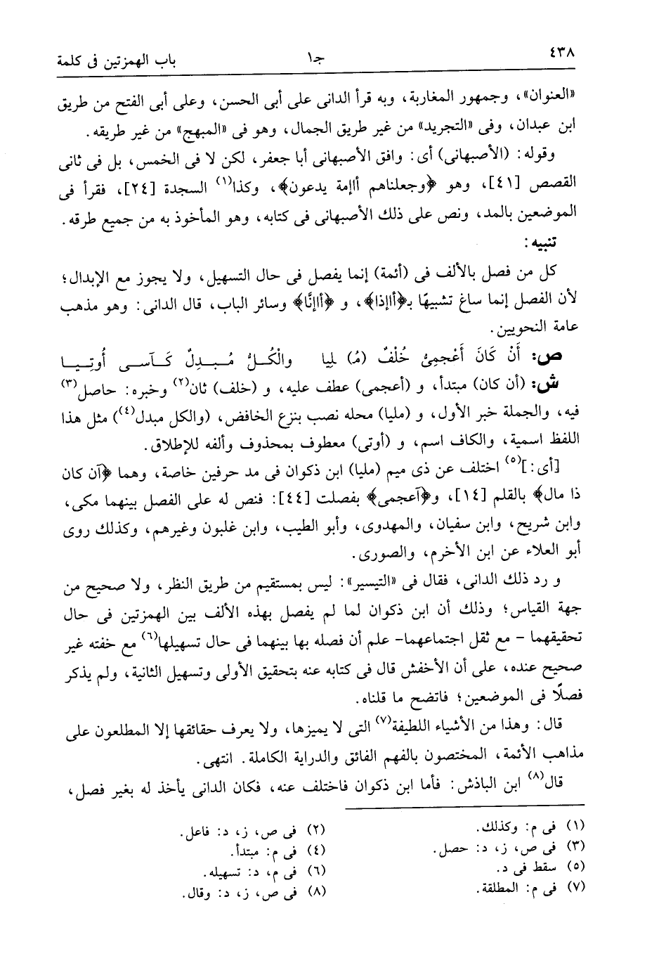 ورد ذلك الدانى، فقال فى «التيسير»: ليس بمستقيم من طريق النظر، ولا صحيح من جهة القياس؛ وذلك أن ابن ذكوان لما لم يفصل بهذه الألف بين الهمزتين فى حال تحقيقهما- مع ثقل اجتماعهما- علم أن فصله بها بينهما فى حال تسهيلها (¬6) مع خفته غير صحيح عنده، على أن الأخفش قال فى كتابه عنه بتحقيق الأولى وتسهيل الثانية، ولم يذكر فصلا فى الموضعين؛ فاتضح ما قلناه.