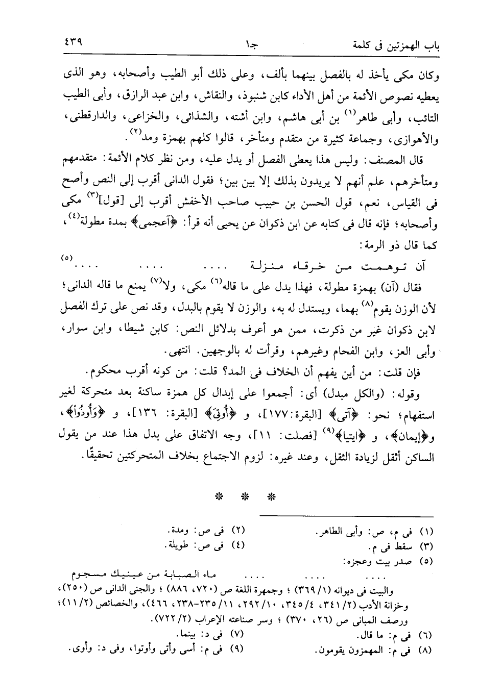 قال المصنف: وليس هذا يعطى الفصل أو يدل عليه، ومن نظر كلام الأئمة: متقدمهم ومتأخرهم، علم أنهم لا يريدون بذلك إلا بين بين؛ فقول الدانى أقرب إلى النص وأصح فى القياس، نعم، قول الحسن بن حبيب صاحب الأخفش أقرب إلى [قول] (¬3) مكى وأصحابه؛ فإنه قال فى كتابه عن ابن ذكوان عن يحيى أنه قرأ: ءَ أَعْجَمِيٌّ بمدة مطولة (¬4)، كما قال ذو الرمة: