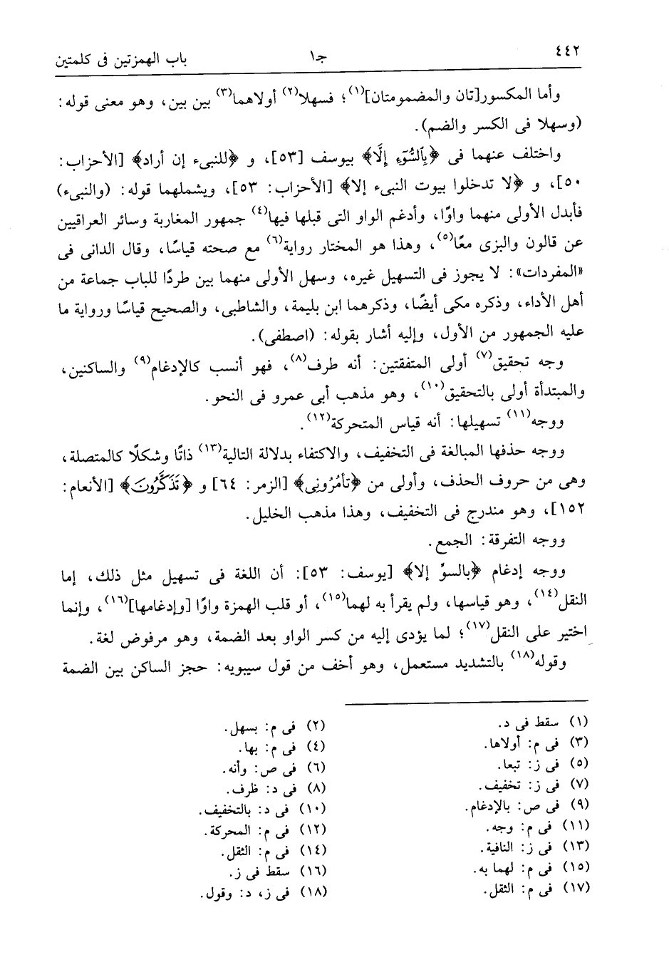 وجه تحقيق (¬7) أولى المتفقتين: أنه طرف (¬8)، فهو أنسب كالإدغام (¬9) والساكنين، والمبتدأة أولى بالتحقيق (¬10)، وهو مذهب أبى عمرو فى النحو.
