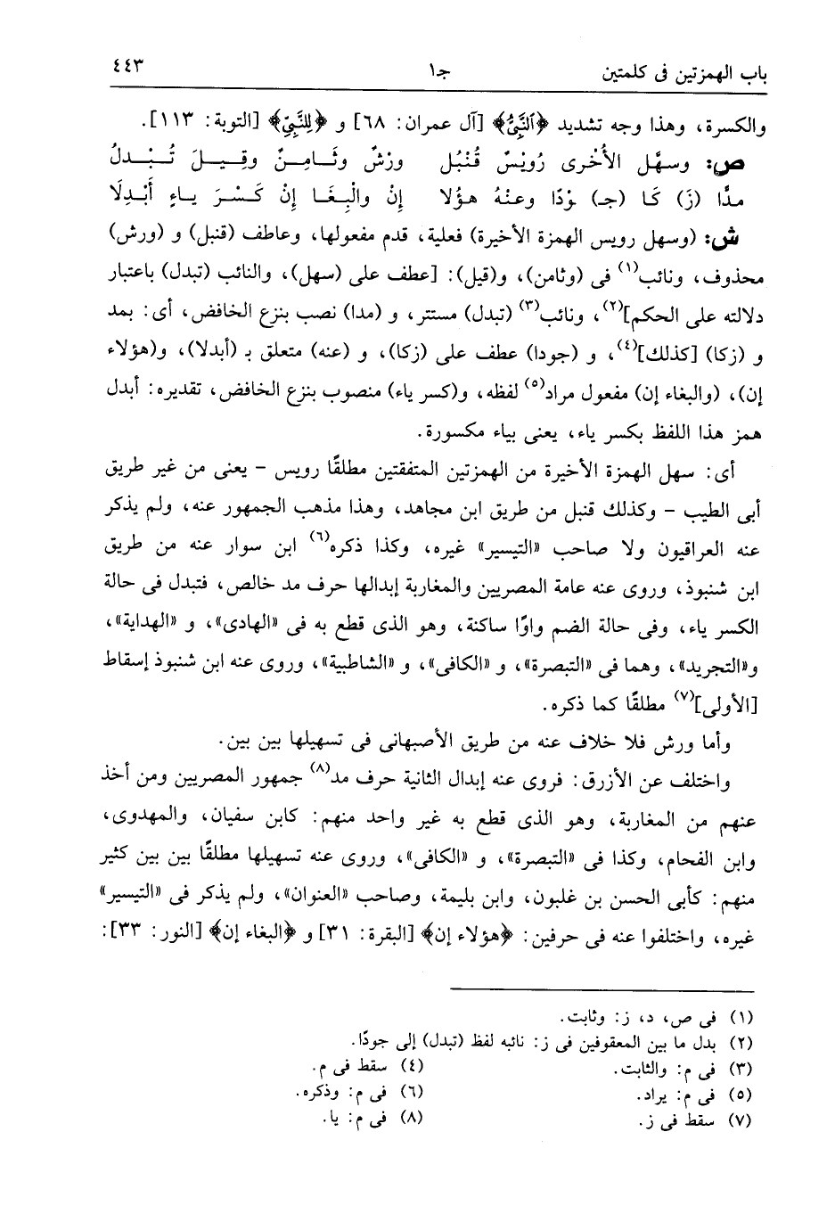 ش: (وسهل رويس الهمزة الأخيرة) فعلية، قدم مفعولها، وعاطف (قنبل) و (ورش) محذوف، ونائب (¬1) فى (وثامن)، و (قيل): [عطف على (سهل)، والنائب (تبدل) باعتبار دلالته على الحكم] (¬2)، ونائب (¬3) (تبدل) مستتر، و (مدا) نصب بنزع الخافض، أى: بمد و (زكا) [كذلك] (¬4)، و (جودا) عطف على (زكا)، و (عنه) متعلق ب (أبدلا)، و (هؤلاء إن)، (والبغاء إن) مفعول مراد (¬5) لفظه، و (كسر ياء) منصوب بنزع الخافض، تقديره: أبدل همز هذا اللفظ بكسر ياء، يعنى بياء مكسورة.