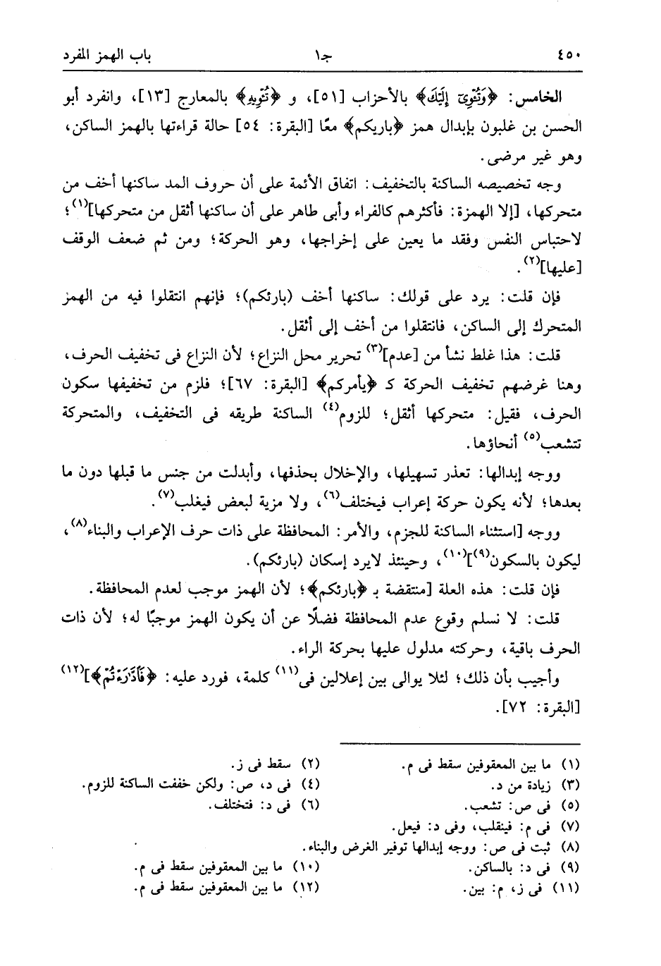 الخامس: وَتُؤْوِي إِلَيْكَ بالأحزاب [51]، وتُؤْوِيهِ بالمعارج [13]، وانفرد أبو الحسن بن غلبون بإبدال همز بارِئِكُمْ معا [البقرة: 54] حالة قراءتها بالهمز الساكن، وهو غير مرضى.