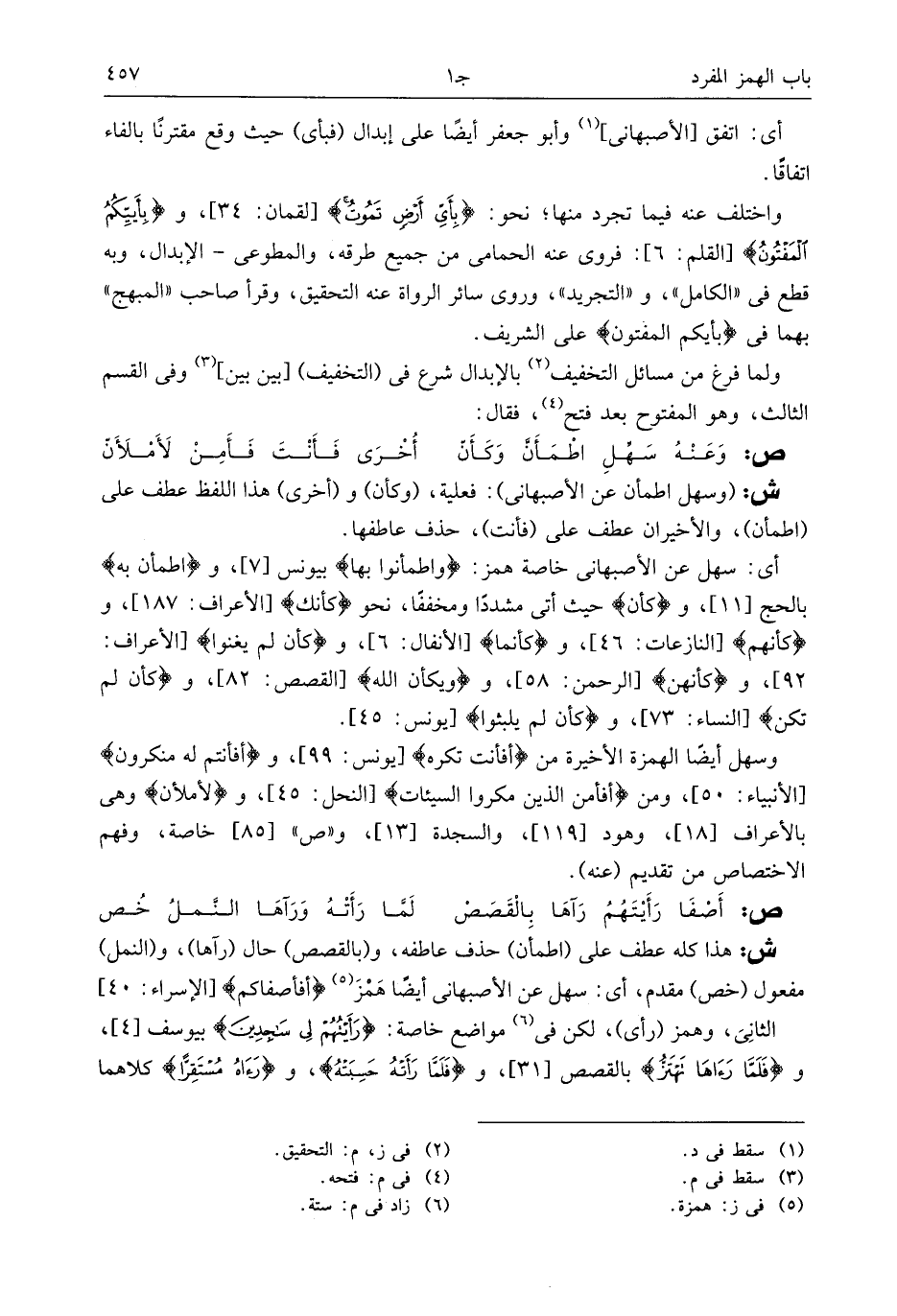 ش: هذا كله عطف على (اطمأن) حذف عاطفه، و (بالقصص) حال (رآها)، و (النمل) مفعول (خص) مقدم، أى: سهل عن الأصبهانى أيضا همز (¬5) أَفَأَصْفاكُمْ [الإسراء: 40] الثانى، وهمز (رأى)، لكن فى (¬6) مواضع خاصة: رَأَيْتُهُمْ لِي ساجِدِينَ بيوسف [4]، وفَلَمَّا رَآها تَهْتَزُّ بالقصص [31]، وفَلَمَّا رَأَتْهُ حَسِبَتْهُ، ورَآهُ مُسْتَقِرًّا كلاهما