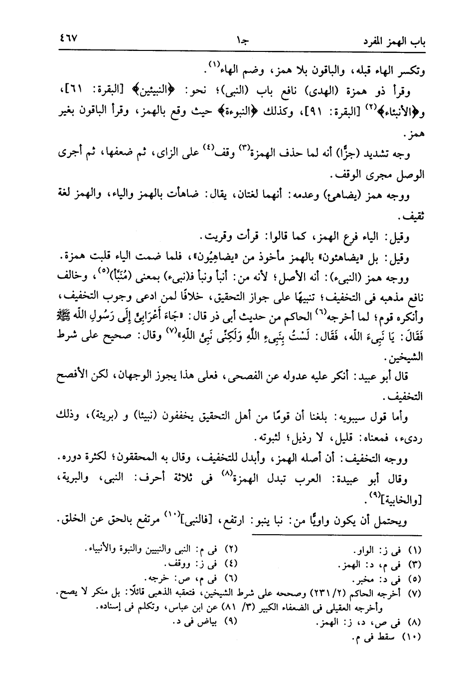 ووجه همز (النبيء): أنه الأصل؛ لأنه من: أنبأ ونبأ ف (نبىء) بمعنى (منبّأ) (¬5)، وخالف نافع مذهبه فى التخفيف؛ تنبيها على جواز التحقيق، خلافا لمن ادعى وجوب التخفيف، وأنكره قوم؛ لما أخرجه (¬6) الحاكم من حديث أبى ذر قال: «جاء أعرابىّ إلى رسول الله صلى الله عليه وسلم فقال: يا نبىء الله، فقال: لست بنبىء الله ولكنّى نبىّ الله» (¬7) وقال: صحيح على شرط الشيخين.