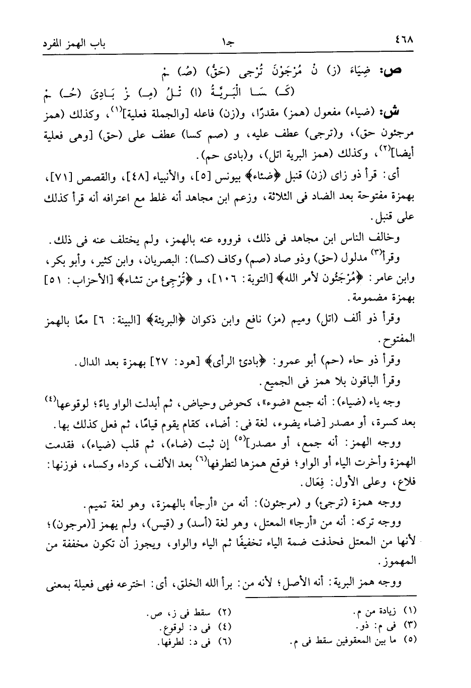 ووجه تركه: أنه من «أرجا» المعتل، وهو لغة (أسد) و (قيس)، ولم يهمز [(مرجون)؛ لأنها من المعتل فحذفت ضمة الياء تخفيفا ثم الياء والواو، ويجوز أن تكون مخففة من المهموز.