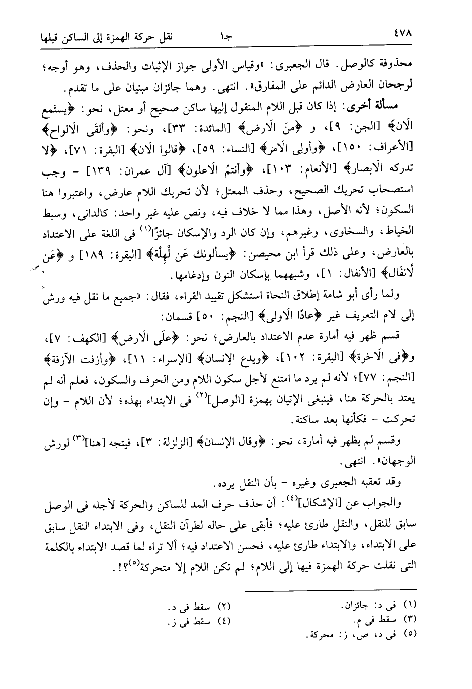 ولما رأى أبو شامة إطلاق النحاة استشكل تقييد القراء، فقال: «جميع ما نقل فيه ورش إلى لام التعريف غير عاداً الْأُولى [النجم: 50] قسمان: