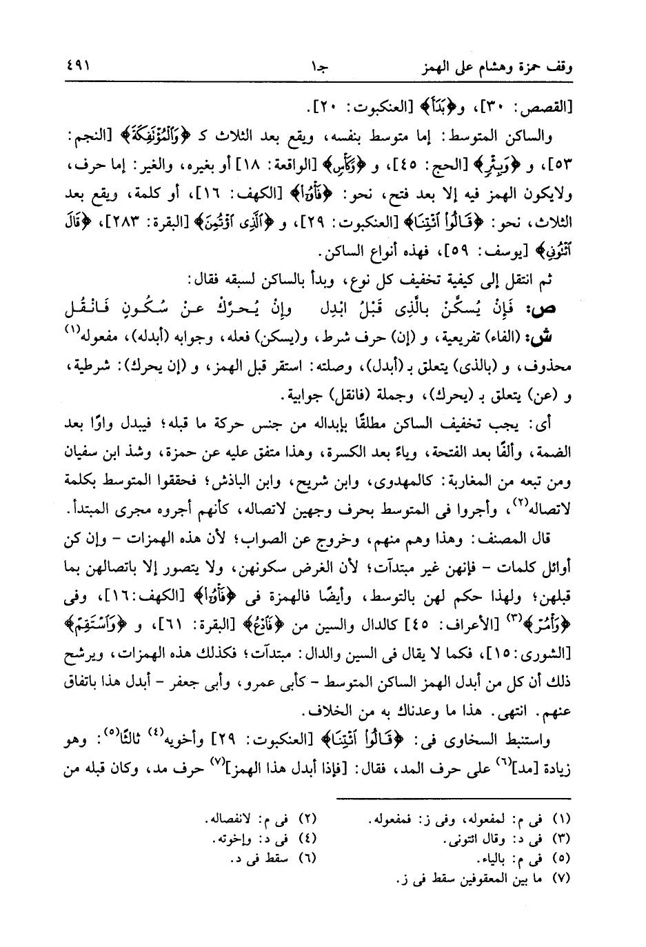 قال المصنف: وهذا وهم منهم، وخروج عن الصواب؛ لأن هذه الهمزات- وإن كن أوائل كلمات- فإنهن غير مبتدآت؛ لأن الغرض سكونهن، ولا يتصور إلا باتصالهن بما قبلهن؛ ولهذا حكم لهن بالتوسط، وأيضا فالهمزة فى فَأْوُوا [الكهف: 16]، وفى وَأْمُرْ (¬3) [الأعراف: 145] كالدال والسين من فَادْعُ [البقرة: 61]، ووَ اسْتَقِمْ [الشورى: 15]، فكما لا يقال فى السين والدال: مبتدآت؛ فكذلك هذه الهمزات، ويرشح ذلك أن كل من أبدل الهمز الساكن المتوسط- كأبى عمرو، وأبى جعفر- أبدل هذا باتفاق عنهم. انتهى. هذا ما وعدناك به من الخلاف.