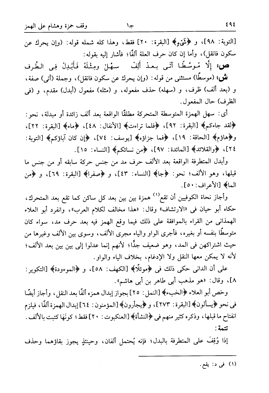 وخص أبو العلاء الْخَبْءَ [النمل: 25] بجواز إبدال همزه ألفا بعد النقل، وأجاز أيضا فى نحو يَسْئَلُونَ [البقرة: 273]، ويَجْأَرُونَ [المؤمنون: 64] إبدال الهمزة ألفا، فيلزم انفتاح ما قبلها، وذكره كثير منهم فى النَّشْأَةَ [العنكبوت: 20] فقط؛ كونها كتبت بالألف.