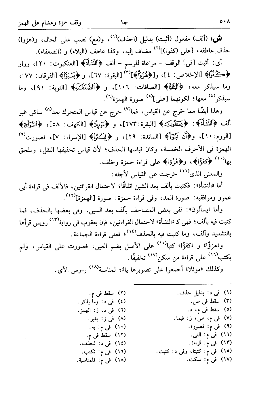 أى: أثبت [فى] الوقف- مراعاة للرسم- ألف النَّشْأَةَ [العنكبوت: 20]، وواو كُفُواً [الإخلاص: 4]، و [هُزُواً] (¬3) [البقرة: 67]، ويَعْبَؤُا [الفرقان: 77]، وما سيذكر معه، البلؤا [الصافات: 106]، والضُّعَفاءِ [التوبة: 91]، وما سيذكر (¬4) معها؛ لكونهما [على] (¬5) صورة الهمزة (¬6).
