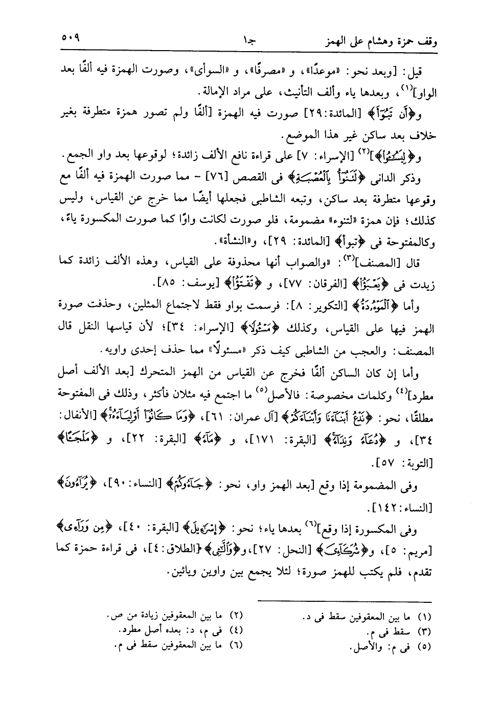وذكر الدانى لَتَنُوأُ بِالْعُصْبَةِ فى القصص [76]- مما صورت الهمزة فيه ألفا مع وقوعها متطرفة بعد ساكن، وتبعه الشاطبى فجعلها أيضا مما خرج عن القياس، وليس كذلك؛ فإن همزة «لتنوأ» مضمومة، فلو صورت لكانت واوا كما صورت المكسورة ياء، وكالمفتوحة فى تَبُوءَ [المائدة: 29]، و «النشأة».