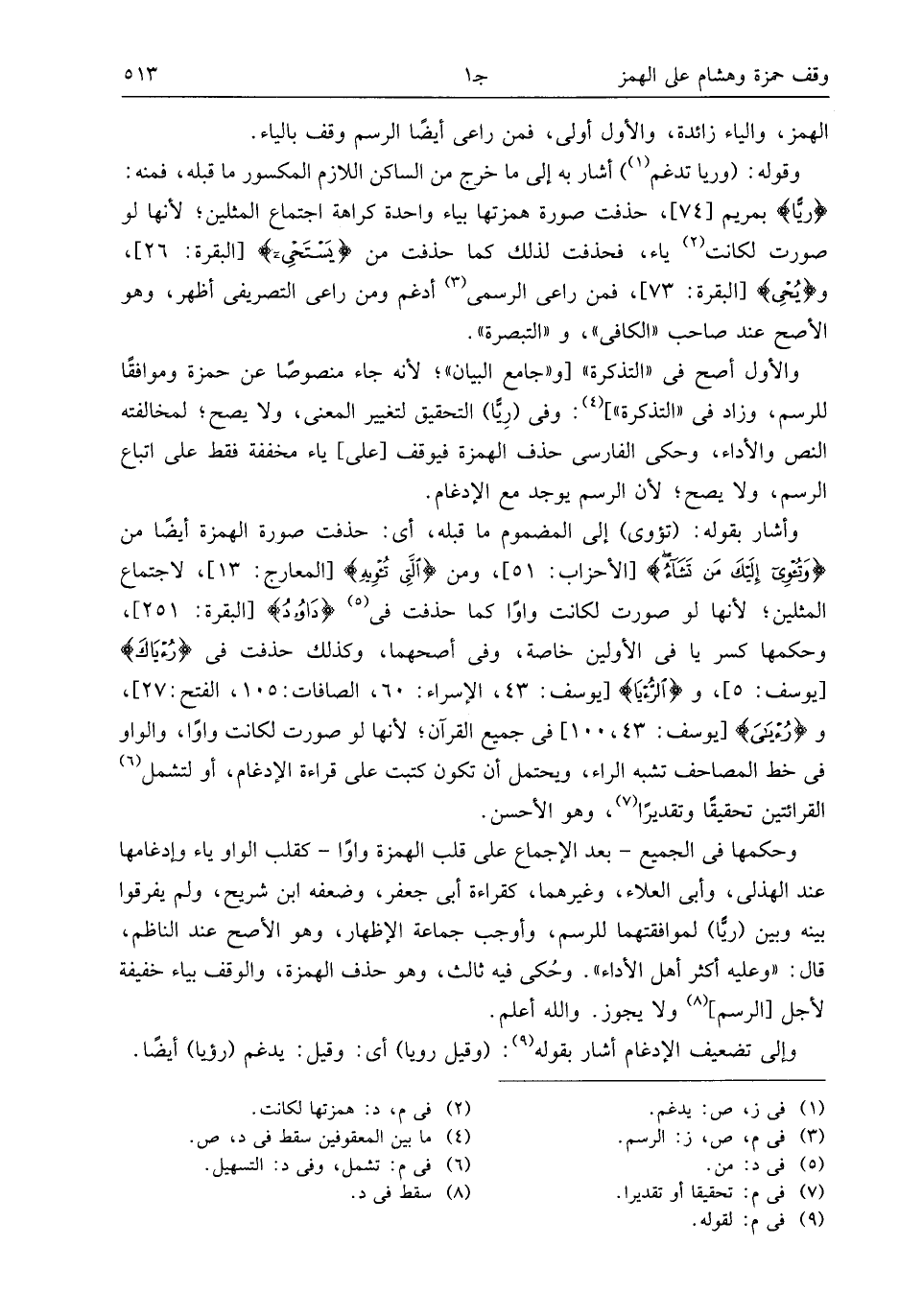 والأول أصح فى «التذكرة» [و «جامع البيان»؛ لأنه جاء منصوصا عن حمزة وموافقا للرسم، وزاد فى «التذكرة»] (¬4): وفى (ريّا) التحقيق لتغيير المعنى، ولا يصح؛ لمخالفته النص والأداء، وحكى الفارسى حذف الهمزة فيوقف [على] ياء مخففة فقط على اتباع الرسم، ولا يصح؛ لأن الرسم يوجد مع الإدغام.