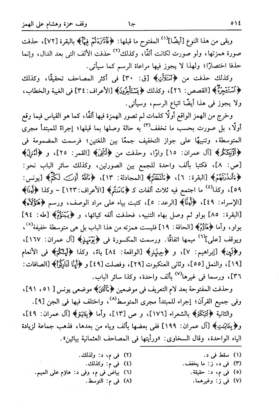 وخرج من الهمز الواقع أولا كلمات لم تصور الهمزة فيها ألفا، كما هو القياس فيما وقع أولا، بل صورت بحسب ما تخفف (¬3) به حالة وصلها بما قبلها؛ إجراء للمبتدإ مجرى المتوسطة، وتنبيها على جواز التخفيف جمعا بين اللغتين؛ فرسمت المضمومة فى أؤنبئكم [آل عمران: 15] واوا، وحذفت من أءلقى [القمر: 25]، وأءنزل [ص: 8]، فكتبا بألف واحدة للجمع بين الصورتين، وكذلك سائر الباب نحو: