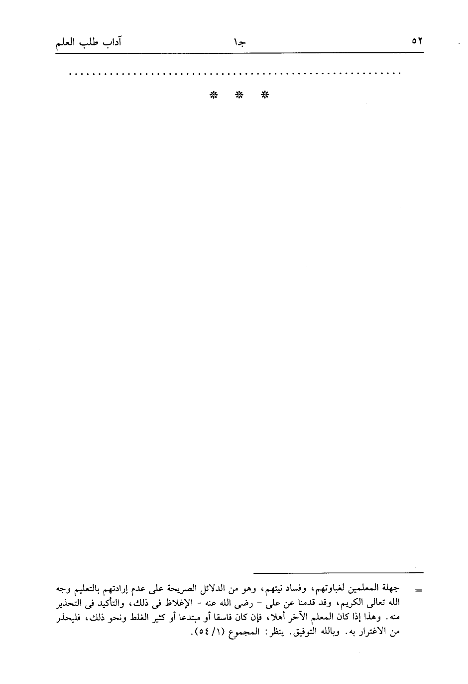 جهلة المعلمين لغباوتهم، وفساد نيتهم، وهو من الدلائل الصريحة على عدم إرادتهم بالتعليم وجه الله تعالى الكريم، وقد قدمنا عن على- رضى الله عنه- الإغلاظ فى ذلك، والتأكيد فى التحذير منه. وهذا إذا كان المعلم الآخر أهلا، فإن كان فاسقا أو مبتدعا أو كثير الغلط ونحو ذلك، فليحذر من الاغترار به. وبالله التوفيق. ينظر: المجموع (1/ 54).