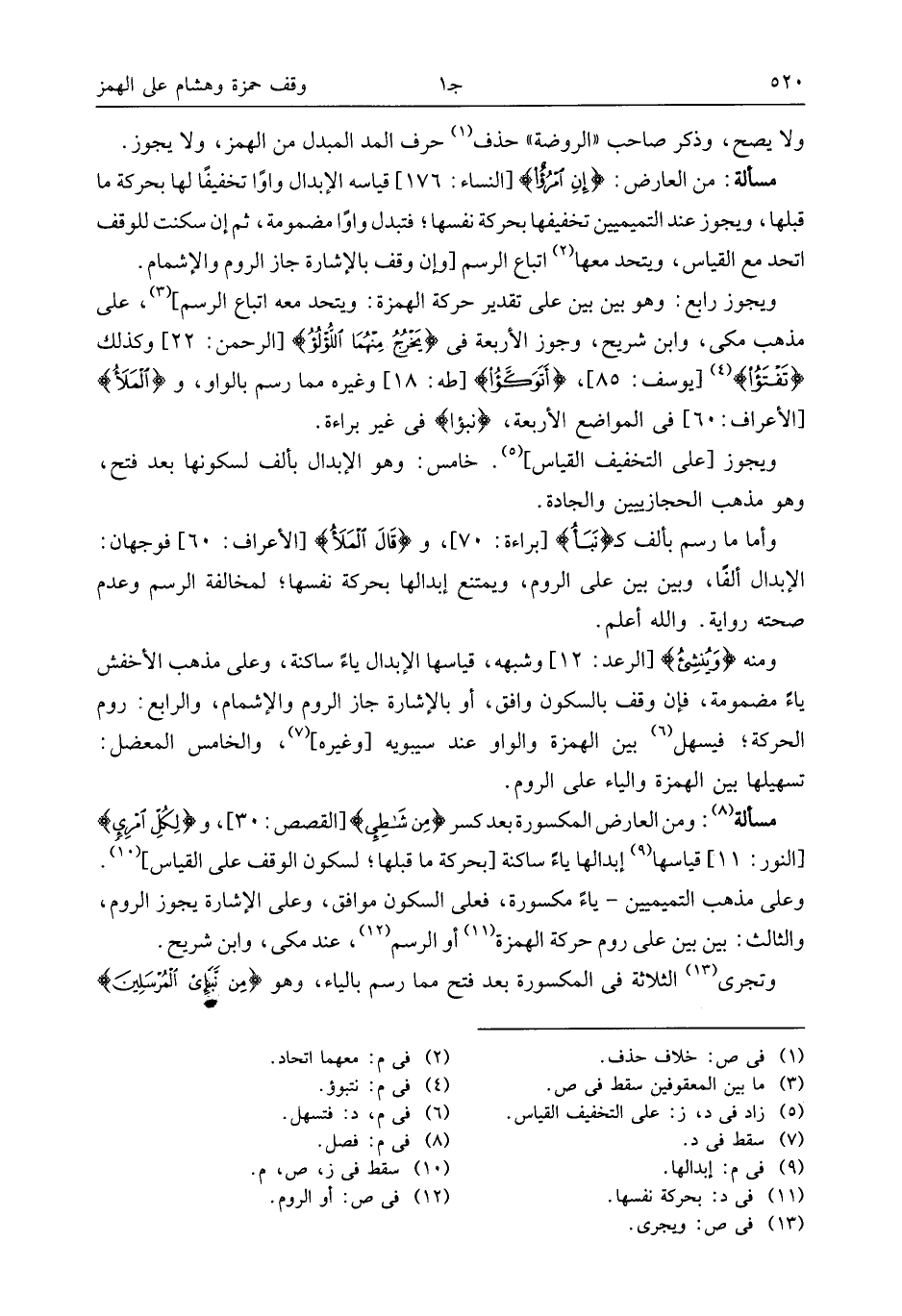 ومنه وَيُنْشِئُ [الرعد: 12] وشبهه، قياسها الإبدال ياء ساكنة، وعلى مذهب الأخفش ياء مضمومة، فإن وقف بالسكون وافق، أو بالإشارة جاز الروم والإشمام، والرابع: روم الحركة؛ فيسهل (¬6) بين الهمزة والواو عند سيبويه [وغيره] (¬7)، والخامس المعضل: