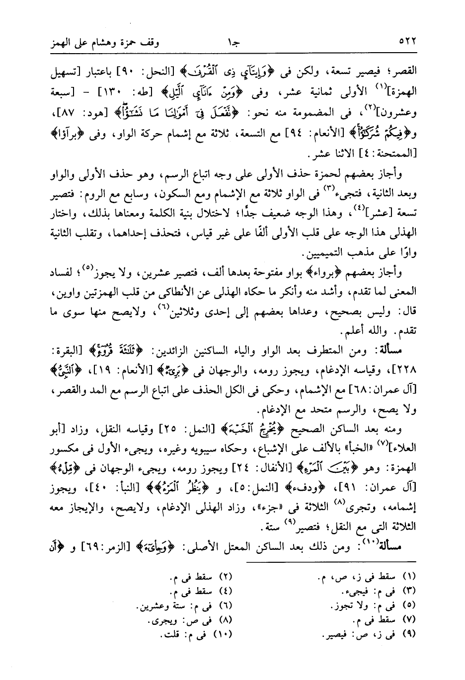 القصر؛ فيصير تسعة، ولكن فى وإيتاى ذى القربى [النحل: 90] باعتبار [تسهيل الهمزة] (¬1) الأولى ثمانية عشر، وفى ومن آناى الليل [طه: 130]-[سبعة وعشرون] (¬2)، فى المضمومة منه نحو: نفعل فى أموالنا ما نشؤا [هود: 87]، وفيكم شركؤا [الأنعام: 94] مع التسعة، ثلاثة مع إشمام حركة الواو، وفى بُرَآؤُا [الممتحنة: 4] الاثنا عشر.