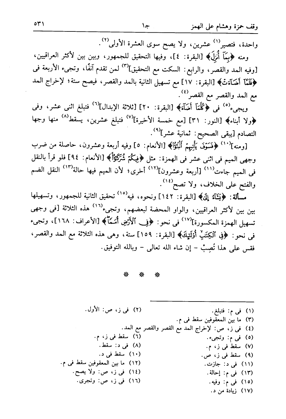 مسألة: يَشاءُ إِلى [البقرة: 142] ونحوه، فيه (¬15) تحقيق الثانية للجمهور، وتسهيلها بين بين لأكثر العراقيين، والواو المحضة لبعضهم، وتجىء (¬16) هذه الثلاثة [فى وجهى تسهيل الهمزة المكسورة] (¬17) فى نحو: فِي الْأَرْضِ أُمَماً [الأعراف: 168]، وتجىء فى نحو: فِي الْكِتابِ أُولئِكَ [البقرة: 159] ستة، وهى هذه الثلاثة مع المد والقصر، فقس على هذا تصب- إن شاء الله تعالى- وبالله التوفيق.