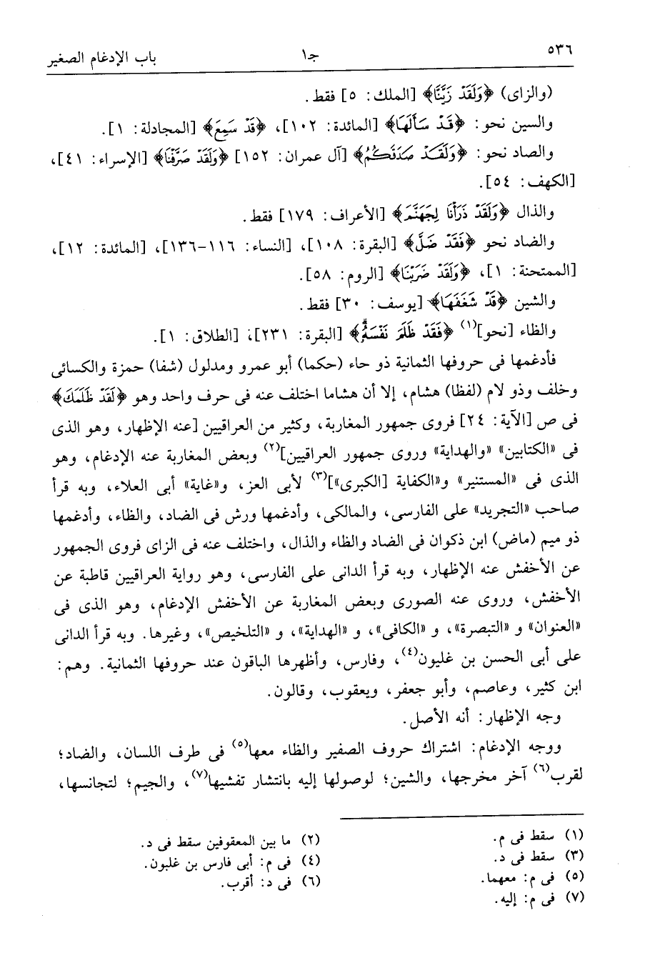 والضاد نحو فَقَدْ ضَلَّ* [البقرة: 108]، [النساء: 116 - 136]، [المائدة: 12]، [الممتحنة: 1]، وَلَقَدْ ضَرَبْنا [الروم: 58].