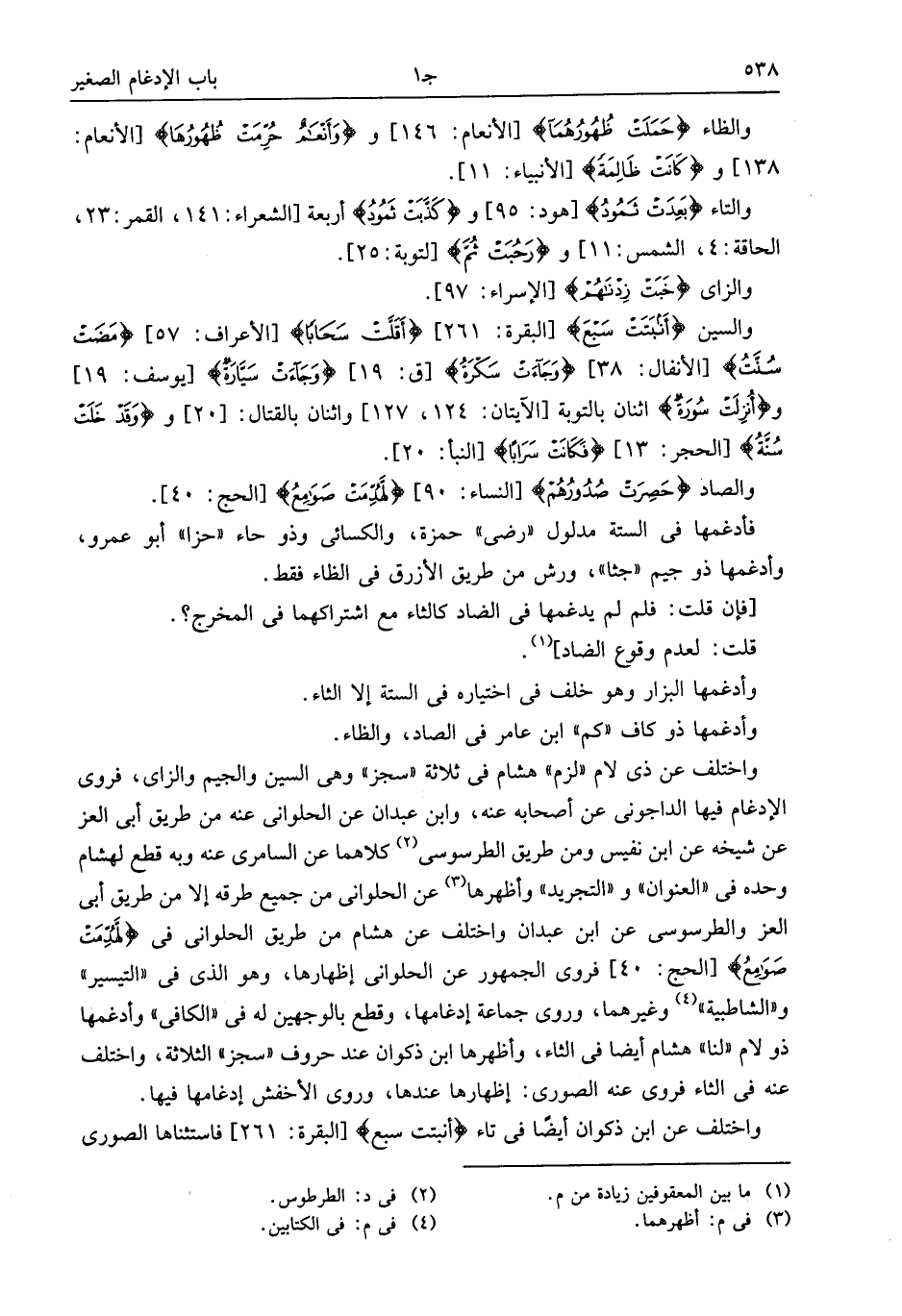 والصاد حَصِرَتْ صُدُورُهُمْ [النساء: 90] لَهُدِّمَتْ صَوامِعُ [الحج: 40].
