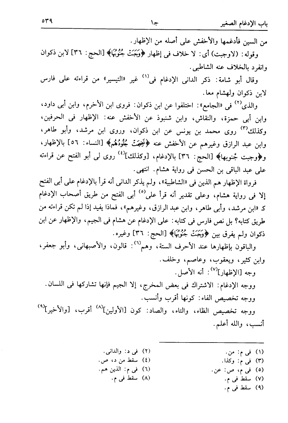 ووجه الإدغام: الاشتراك فى بعض المخرج، إلا الجيم فإنها تشاركها فى اللسان.