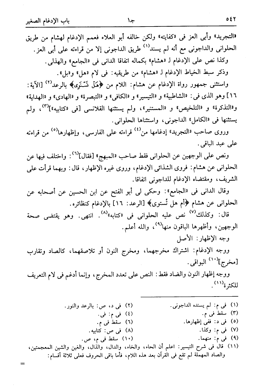 «التجريد» وأبى العز فى «كفايته» ولكن خالفه أبو العلاء فعمم الإدغام لهشام من طريق الحلوانى والداجونى مع أنه لم يسند (¬1) طريق الداجونى إلا من قراءته على أبى العز.