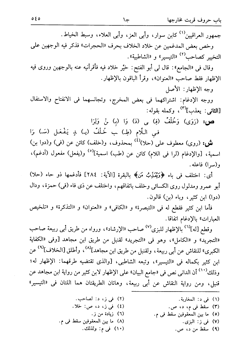 وقال فى «الجامع»: قال لى أبو الفتح: خيّر خلاد فيه فأقرأنيه عنه بالوجهين وروى فيه الإظهار فقط صاحب «العنوان»، وقرأ الباقون بالإظهار.