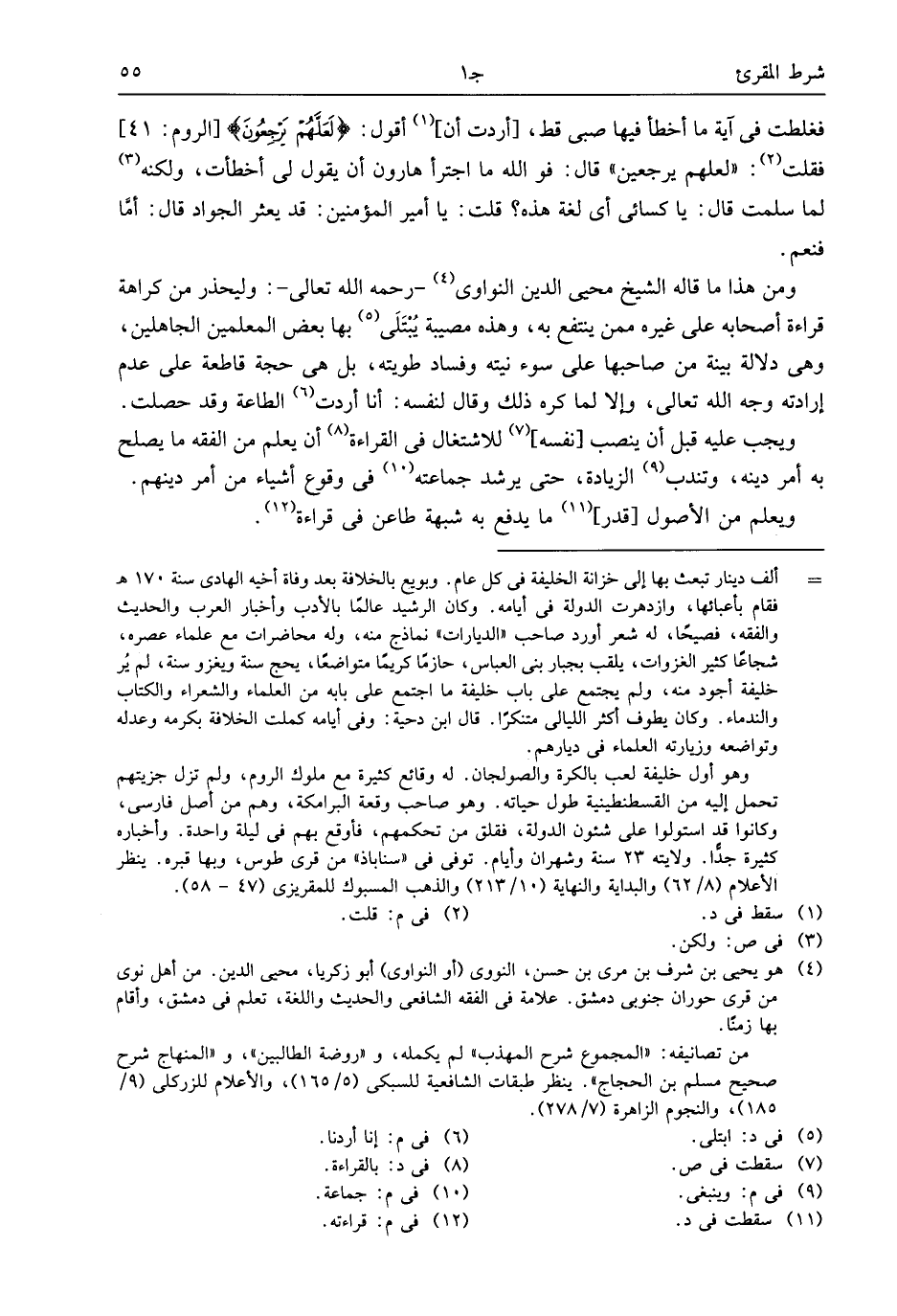 (¬4) هو يحيى بن شرف بن مرى بن حسن، النووى (أو النواوى) أبو زكريا، محيى الدين. من أهل نوى من قرى حوران جنوبى دمشق. علامة فى الفقه الشافعى والحديث واللغة، تعلم فى دمشق، وأقام بها زمنا.
