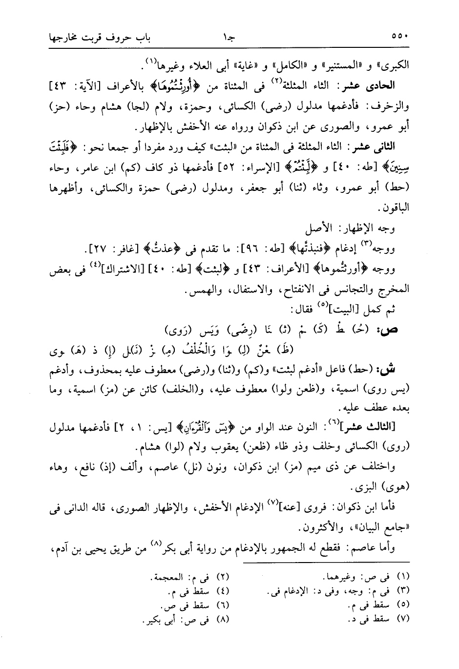الثانى عشر: الثاء المثلثة فى المثناة من «لبثت» كيف ورد مفردا أو جمعا نحو: فَلَبِثْتَ سِنِينَ [طه: 40] ولَبِثْتُمْ [الإسراء: 52] فأدغمها ذو كاف (كم) ابن عامر، وحاء (حط) أبو عمرو، وثاء (ثنا) أبو جعفر، ومدلول (رضى) حمزة والكسائى، وأظهرها الباقون.
