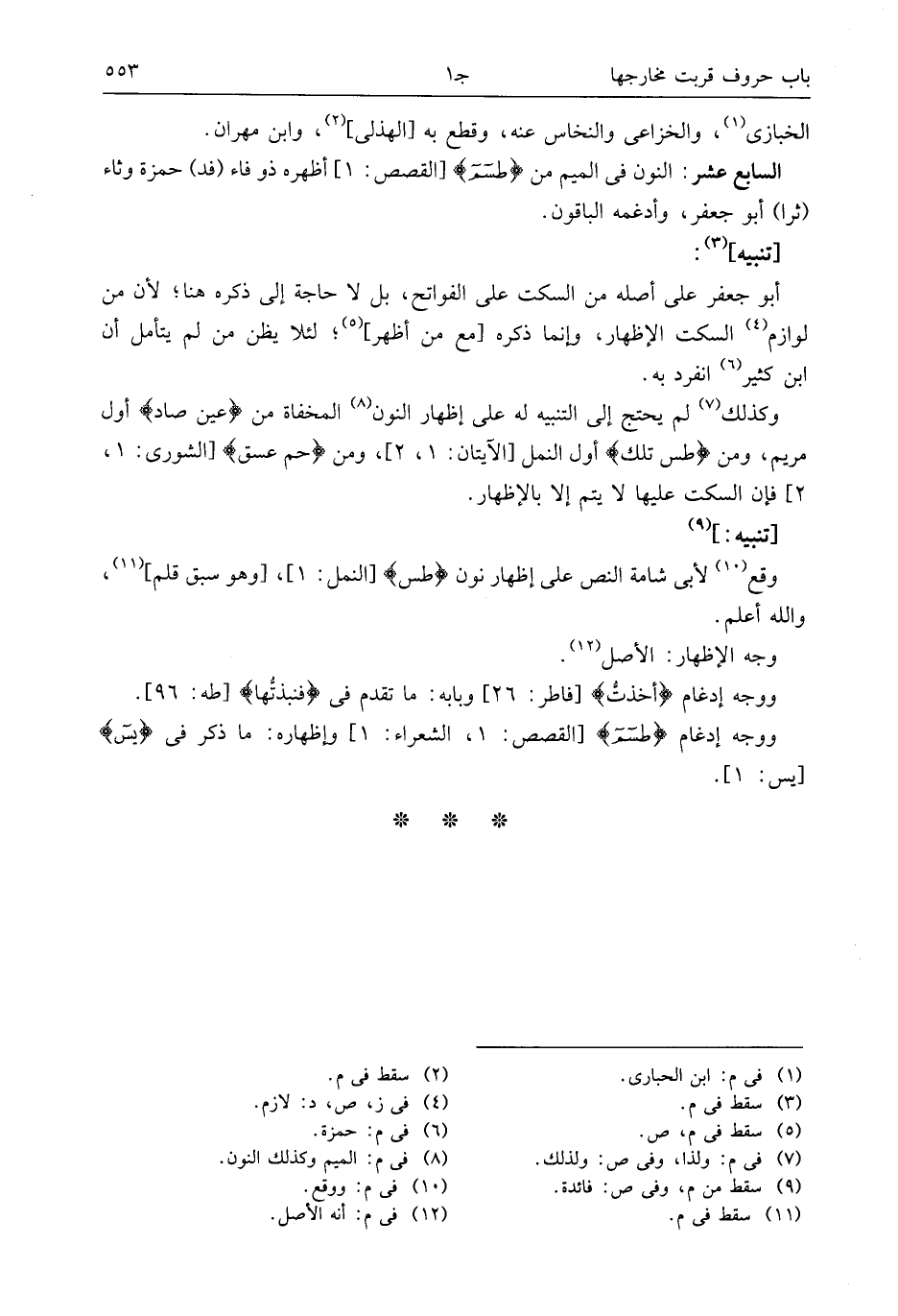 [تنبيه:] (¬9) وقع (¬10) لأبى شامة النص على إظهار نون طس [النمل: 1]، [وهو سبق قلم] (¬11)، والله أعلم.