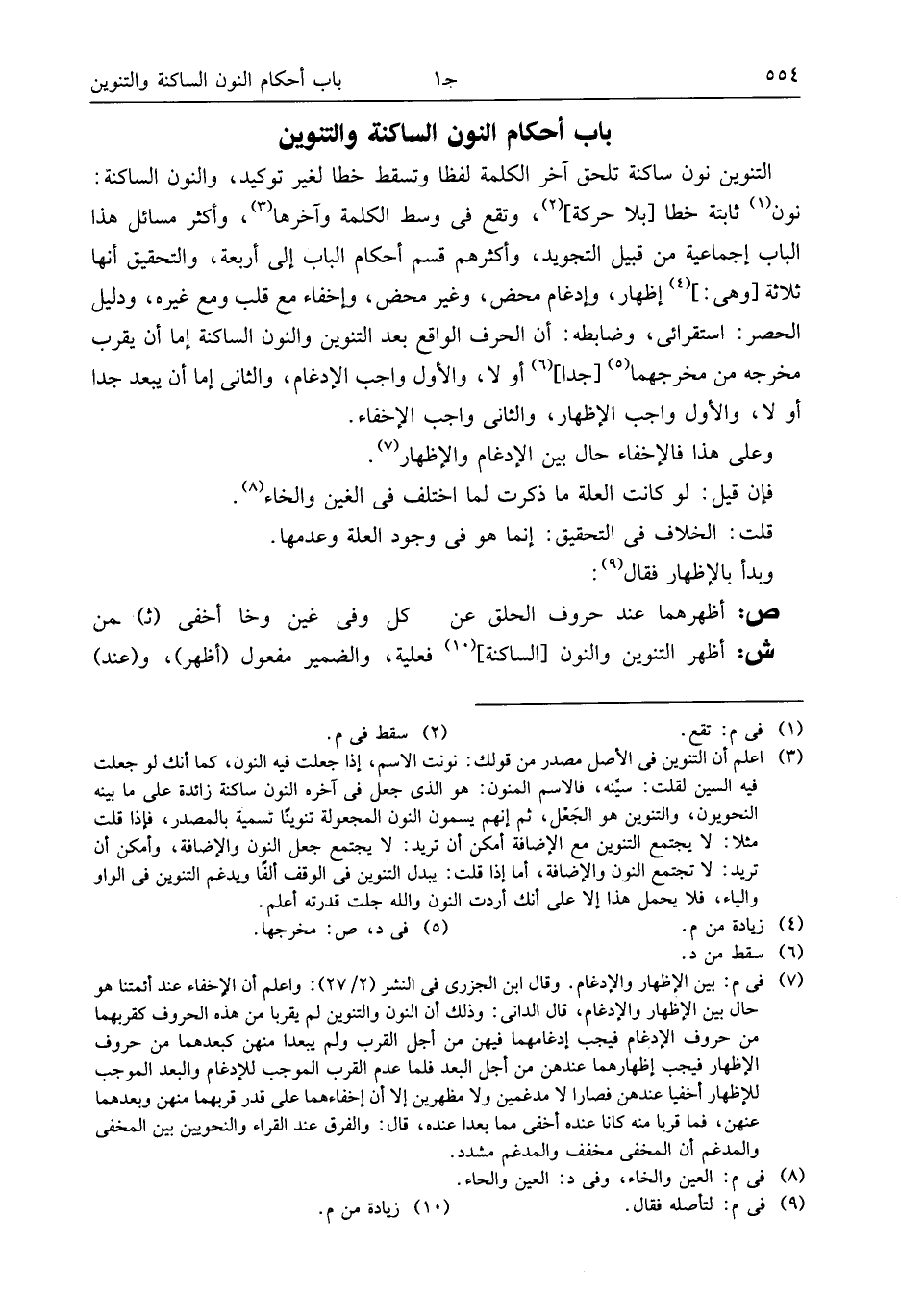 نون (¬1) ثابتة خطا [بلا حركة] (¬2)، وتقع فى وسط الكلمة وآخرها (¬3)، وأكثر مسائل هذا الباب إجماعية من قبيل التجويد، وأكثرهم قسم أحكام الباب إلى أربعة، والتحقيق أنها ثلاثة [وهى:] (¬4) إظهار، وإدغام محض، وغير محض، وإخفاء مع قلب ومع غيره، ودليل الحصر: استقرائى، وضابطه: أن الحرف الواقع بعد التنوين والنون الساكنة إما أن يقرب مخرجه من مخرجهما (¬5) [جدا] (¬6) أو لا، والأول واجب الإدغام، والثانى إما أن يبعد جدا أو لا، والأول واجب الإظهار، والثانى واجب الإخفاء.