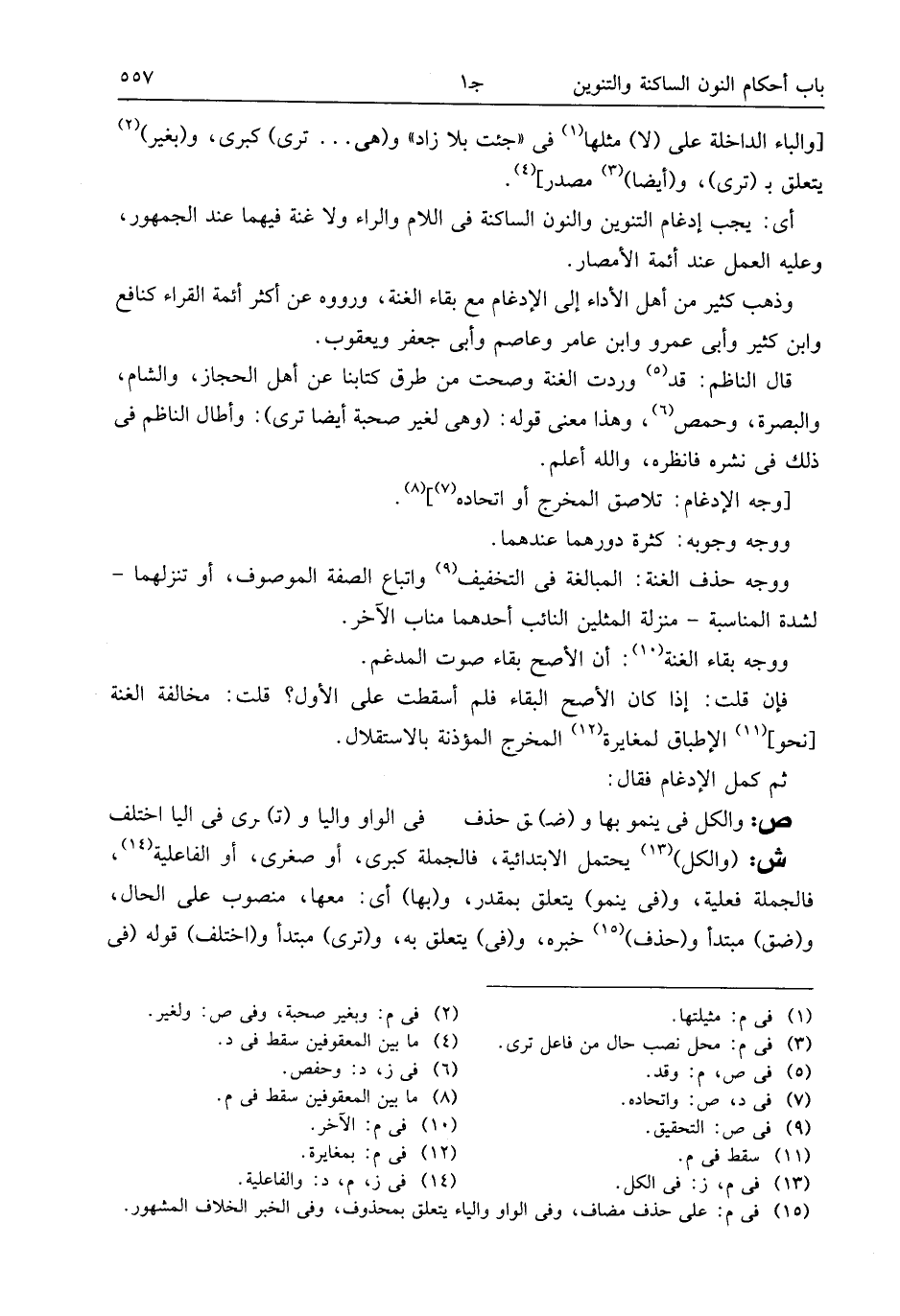 ووجه حذف الغنة: المبالغة فى التخفيف (¬9) واتباع الصفة الموصوف، أو تنزلهما- لشدة المناسبة- منزلة المثلين النائب أحدهما مناب الآخر.