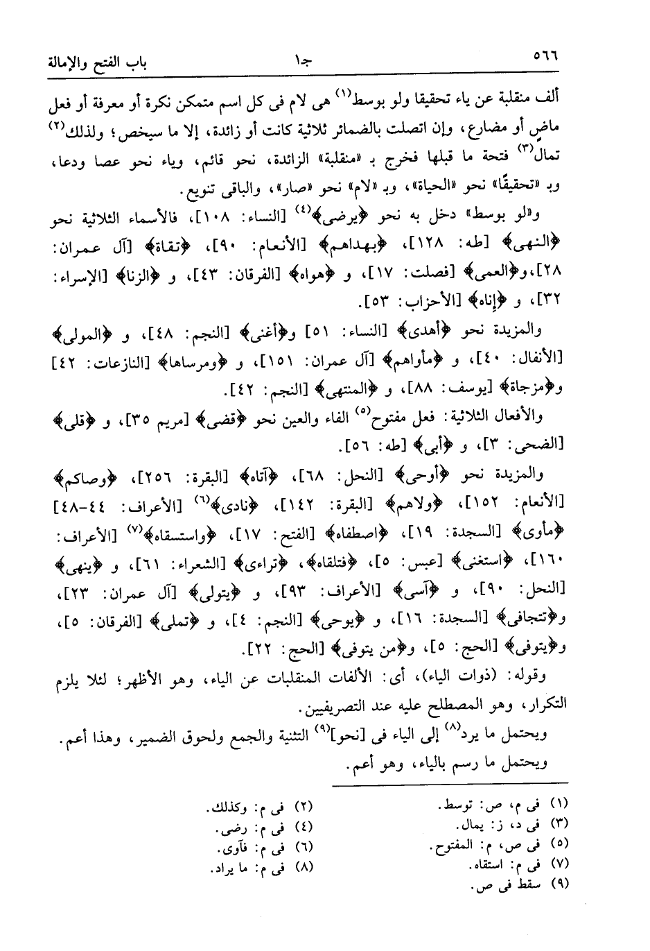 والمزيدة نحو أَهْدى [النساء: 51] وأَغْنى [النجم: 48]، والْمَوْلى [الأنفال: 40]، ومَأْواهُمُ [آل عمران: 151]، ووَ مُرْساها [النازعات: 42] ومُزْجاةٍ [يوسف: 88]، والْمُنْتَهى [النجم: 42].