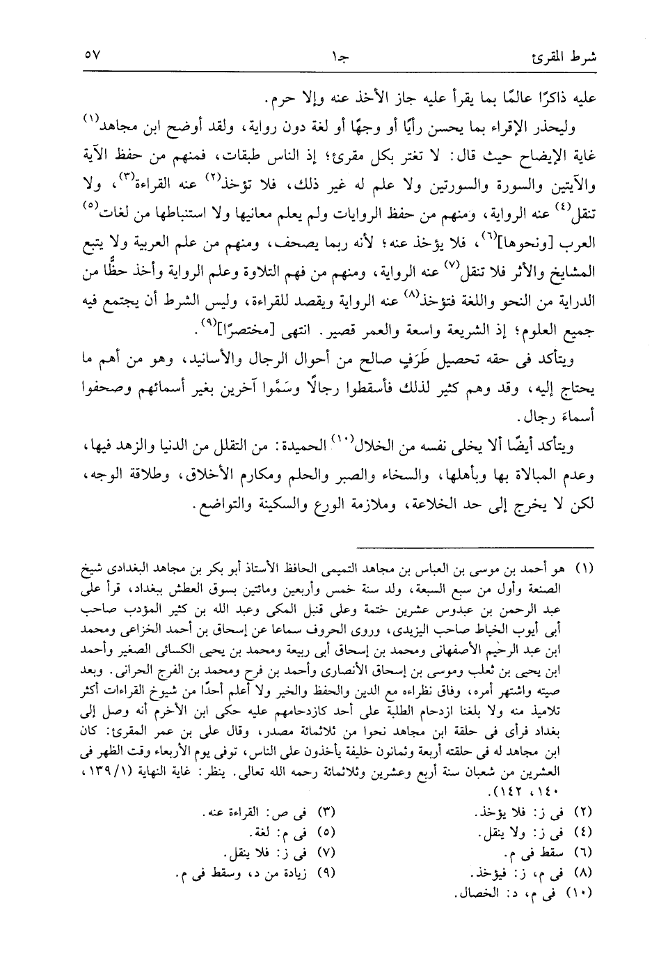وليحذر الإقراء بما يحسن رأيا أو وجها أو لغة دون رواية، ولقد أوضح ابن مجاهد (¬1) غاية الإيضاح حيث قال: لا تغتر بكل مقرئ؛ إذ الناس طبقات، فمنهم من حفظ الآية والآيتين والسورة والسورتين ولا علم له غير ذلك، فلا تؤخذ (¬2) عنه القراءة (¬3)، ولا تنقل (¬4) عنه الرواية، ومنهم من حفظ الروايات ولم يعلم معانيها ولا استنباطها من لغات (¬5) العرب [ونحوها] (¬6)، فلا يؤخذ عنه؛ لأنه ربما يصحف، ومنهم من علم العربية ولا يتبع المشايخ والأثر فلا تنقل (¬7) عنه الرواية، ومنهم من فهم التلاوة وعلم الرواية وأخذ حظّا من الدراية من النحو واللغة فتؤخذ (¬8) عنه الرواية ويقصد للقراءة، وليس الشرط أن يجتمع فيه جميع العلوم؛ إذ الشريعة واسعة والعمر قصير. انتهى [مختصرا] (¬9).