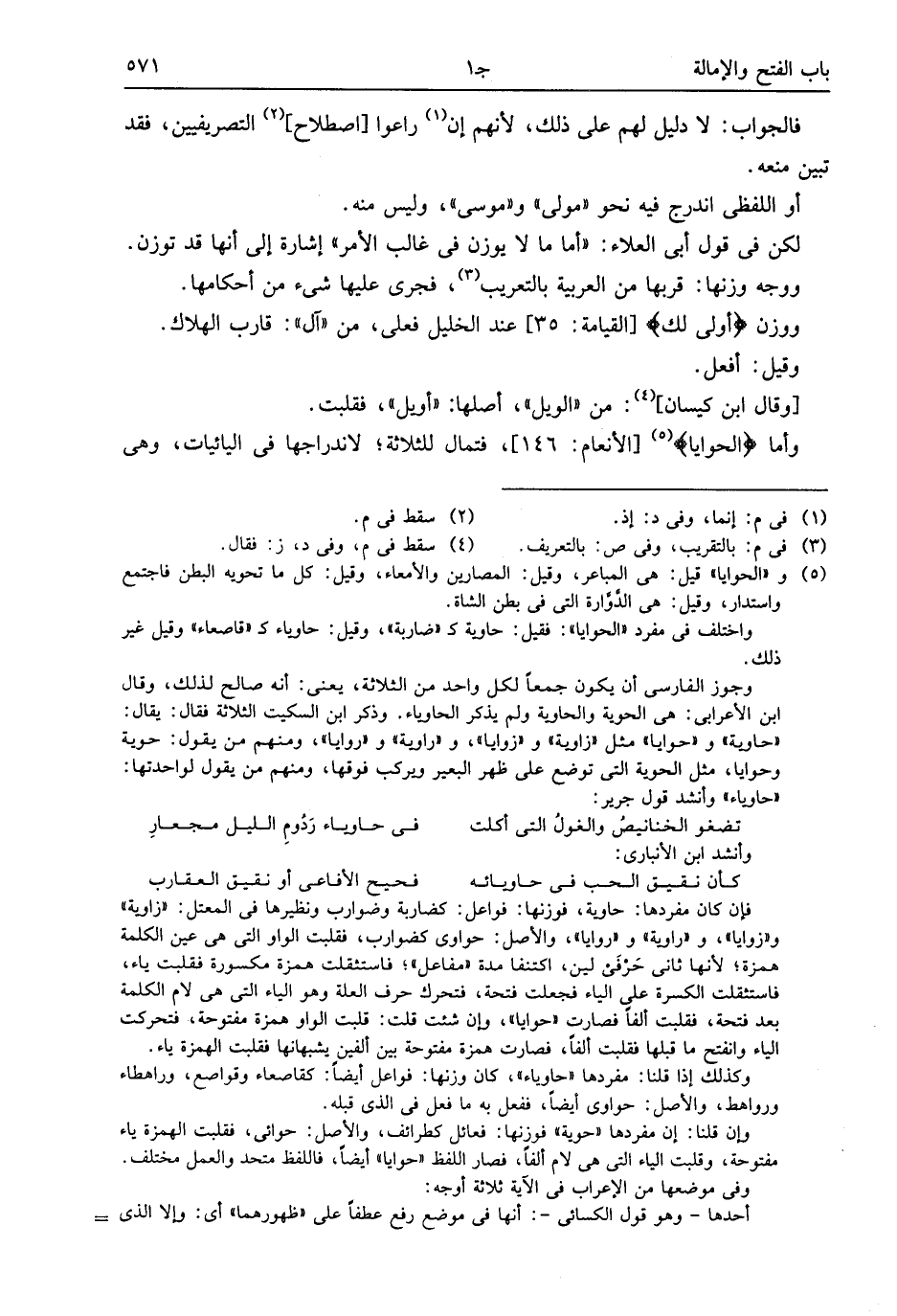 وإن قلنا: إن مفردها «حوية» فوزنها: فعائل كطرائف، والأصل: حوائى، فقلبت الهمزة ياء مفتوحة، وقلبت الياء التى هى لام ألفا، فصار اللفظ «حوايا» أيضا، فاللفظ متحد والعمل مختلف.