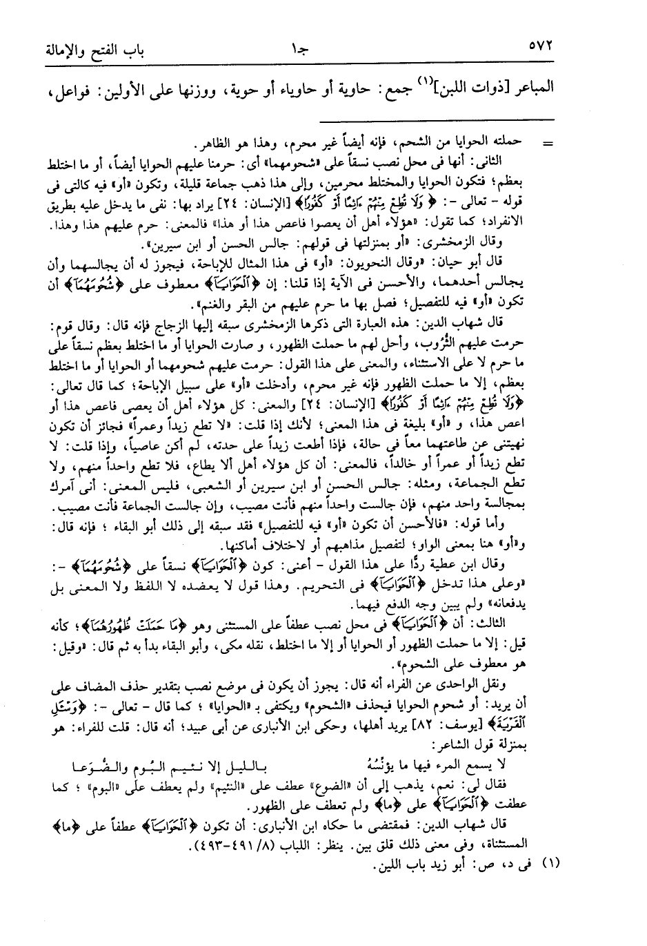 قال أبو حيان: «وقال النحويون: «أو» فى هذا المثال للإباحة، فيجوز له أن يجالسهما وأن يجالس أحدهما، والأحسن فى الآية إذا قلنا: إن الْحَوايا معطوف على شُحُومَهُما أن تكون «أو» فيه للتفصيل؛ فصل بها ما حرم عليهم من البقر والغنم».