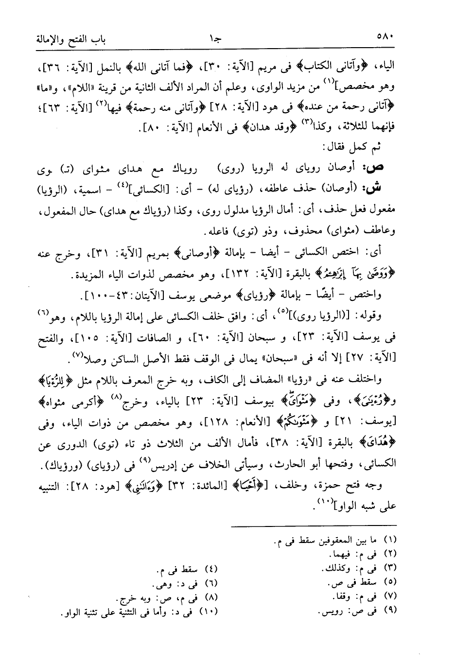 واختلف عنه فى «رؤيا» المضاف إلى الكاف، وبه خرج المعرف باللام مثل لِلرُّءْيا ورُءْيايَ*، وفى مَثْوايَ بيوسف [الآية: 23] بالياء، وخرج (¬8) أَكْرِمِي مَثْواهُ [يوسف: 21] ومَثْواكُمْ [الأنعام: 128]، وهو مخصص من ذوات الياء، وفى هُدايَ بالبقرة [الآية: 38]، فأمال الألف من الثلاث ذو تاء (توى) الدورى عن الكسائى، وفتحها أبو الحارث، وسيأتى الخلاف عن إدريس (¬9) فى (رؤياى) (ورؤياك).