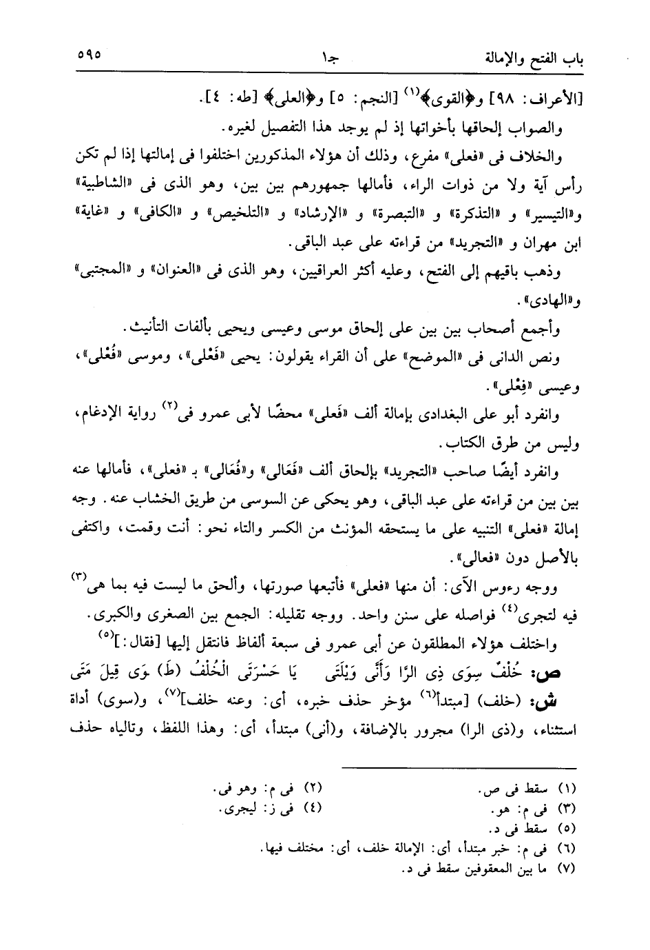 والخلاف فى «فعلى» مفرع، وذلك أن هؤلاء المذكورين اختلفوا فى إمالتها إذا لم تكن رأس آية ولا من ذوات الراء، فأمالها جمهورهم بين بين، وهو الذى فى «الشاطبية» و «التيسير» و «التذكرة» و «التبصرة» و «الإرشاد» و «التلخيص» و «الكافى» و «غاية» ابن مهران و «التجريد» من قراءته على عبد الباقى.