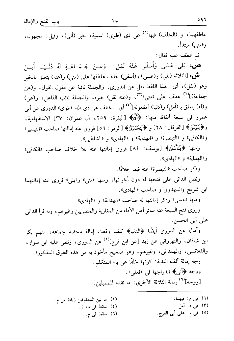 ش: [الثلاثة (بلى) و (عسى) و (أسفى) حذف عاطفها على (متى) و (عنه) يتعلق بالخبر وهو (نقل)، أى: هذا اللفظ نقل عن الدورى، والجملة نائبة عن مقول القول، و (عن جماعة)] (¬2) عطف على «متى» (¬3)، و (عنه نقل) خبره، والجملة نائب الفاعل، و (عن) و (له) يتعلق ب (أمل) و (دنيا) [مفعوله] (¬4) أى: اختلف عن ذى طاء «طوى» الدورى عن أبى عمرو فى سبعة ألفاظ منها: أَنَّى* [البقرة: 259، آل عمران: 37] الاستفهامية، ويا وَيْلَتى [الفرقان: 28] ويا حَسْرَتى [الزمر: 56] فروى عنه إمالتها صاحب «التيسير» و «الكافى» و «التبصرة» و «الهداية» و «الهادى» و «الشاطبى».