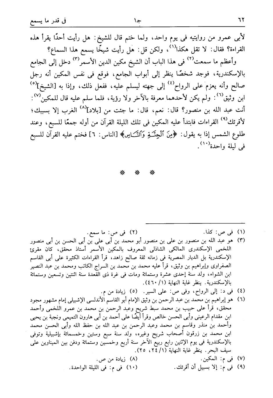 أنت عبد الله بن منصور؟ قال: نعم، قال: ما جئت من [بلاد] (¬8) الغرب إلا بسببك؛ لأقرئك (¬9) القراءات فابتدأ عليه المكين فى تلك الليلة القرآن من أوله جمعا للسبع، وعند طلوع الشمس إذا به يقول: مِنَ الْجِنَّةِ وَالنَّاسِ [الناس: 6] فختم عليه القرآن للسبع فى ليلة واحدة (¬10).