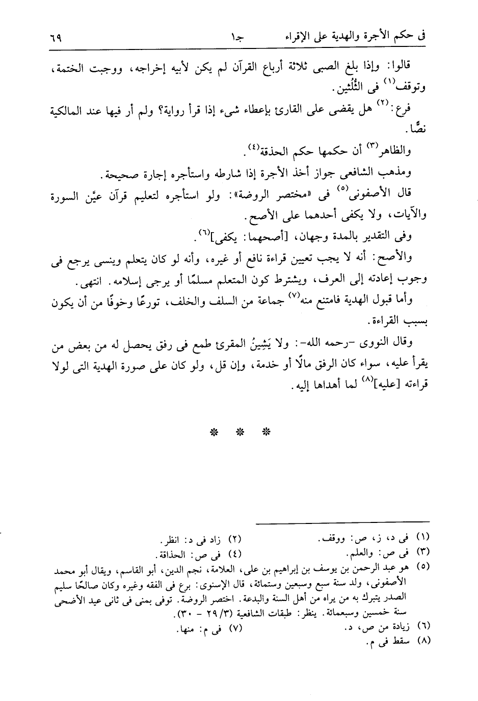 (¬5) هو عبد الرحمن بن يوسف بن إبراهيم بن على، العلامة، نجم الدين، أبو القاسم، ويقال أبو محمد الأصفونى، ولد سنة سبع وسبعين وستمائة، قال الإسنوى: برع فى الفقه وغيره وكان صالحا سليم الصدر يتبرك به من يراه من أهل السنة والبدعة. اختصر الروضة. توفى بمنى فى ثانى عيد الأضحى سنة خمسين وسبعمائة. ينظر: طبقات الشافعية (3/ 29 - 30).