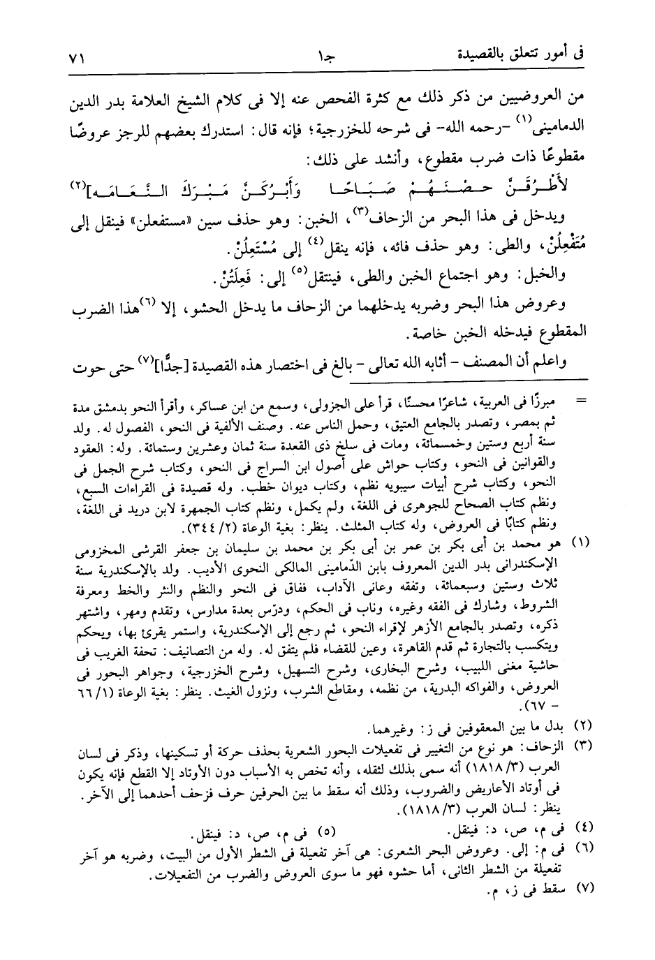 (¬1) هو محمد بن أبى بكر بن عمر بن أبى بكر بن محمد بن سليمان بن جعفر القرشى المخزومى الإسكندرانى بدر الدين المعروف بابن الدّمامينى المالكى النحوى الأديب. ولد بالإسكندرية سنة ثلاث